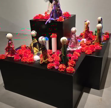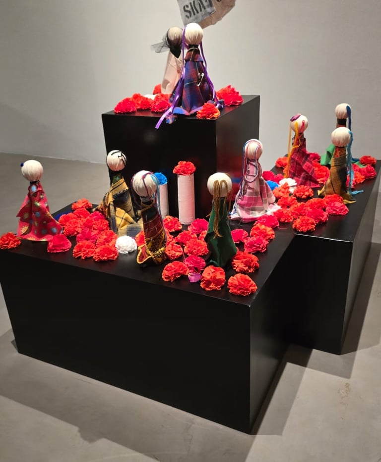Técnica textil 10 muñecas recicladas. Telas, materiales reciclados. Representan mujeres de la organización desaparecidas.