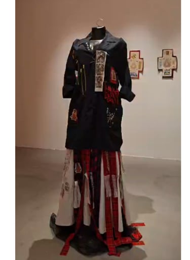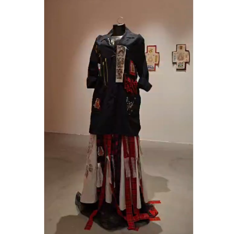 Técnica textil - intervención reciclaje mandil obrero Pieza integrado con apliques sublimados, textos, tiras tela reciclada. 100 cabezas de cierre rojas - interpretación personas desaparecidas