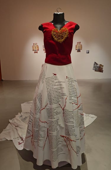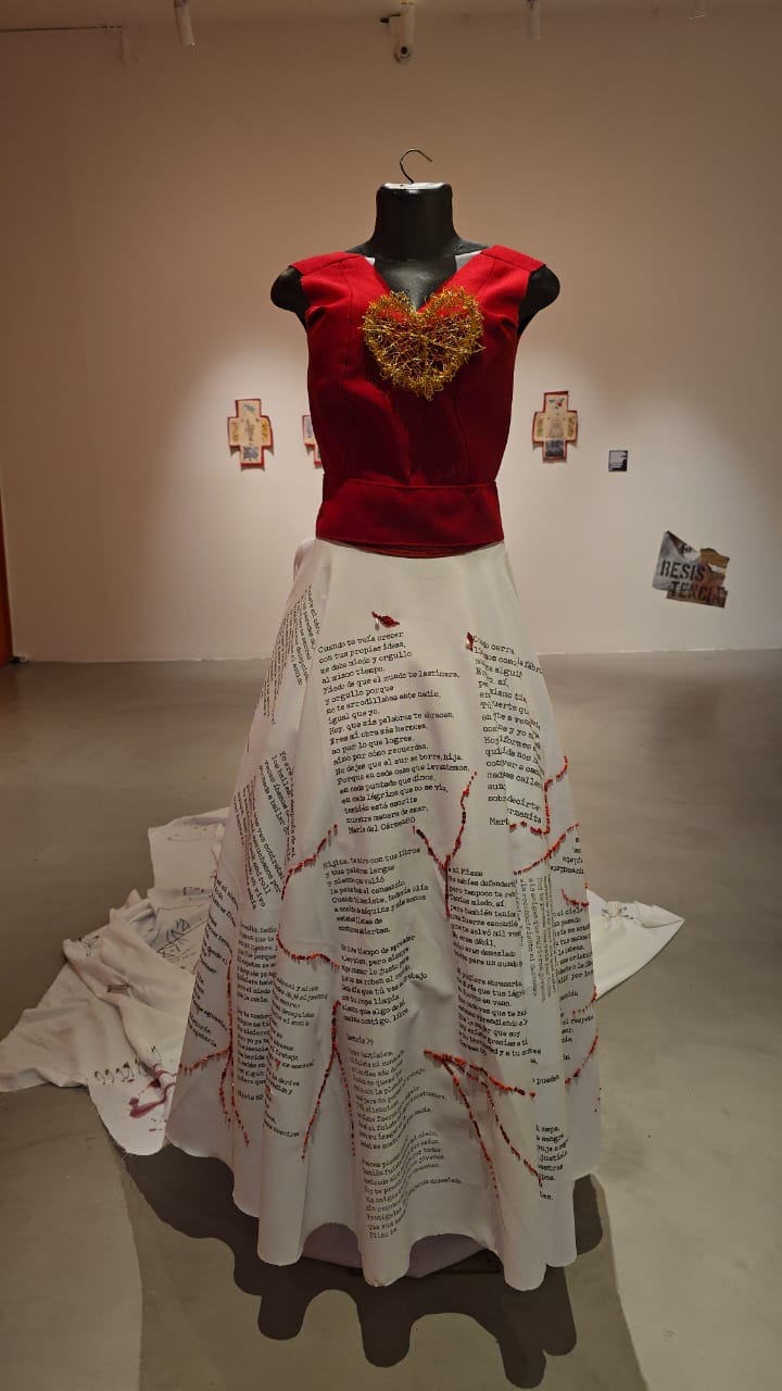 Técnica textil - sublimado confección a mano. Pieza corazón - Nido metálico, baño de oro. Pieza integra conformada por faltda, corpiño. La falta esta configurada con 20 cartas sublimadas de obreras que cuentas sus experiencias sobre su vida en las fábricas dirigen a modo carta a su familia y sus emociones sobre el tiempo y relato. bordado con canutillo rojo.