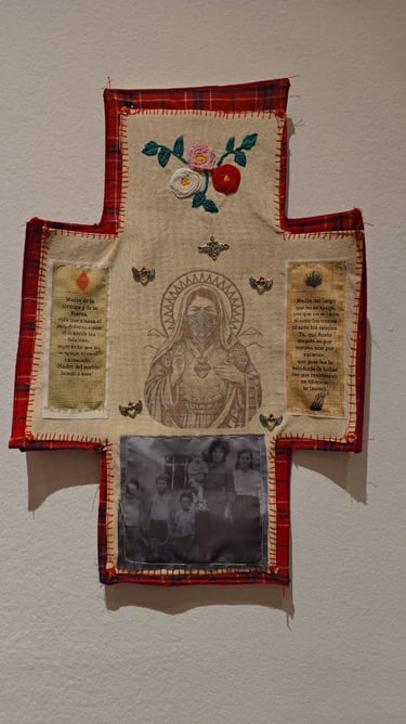 Técnica textil - bordado / sublimación Devocionales intervenidos por mujeres obreras de fábricas del sur de Quito. Edad 80 años.